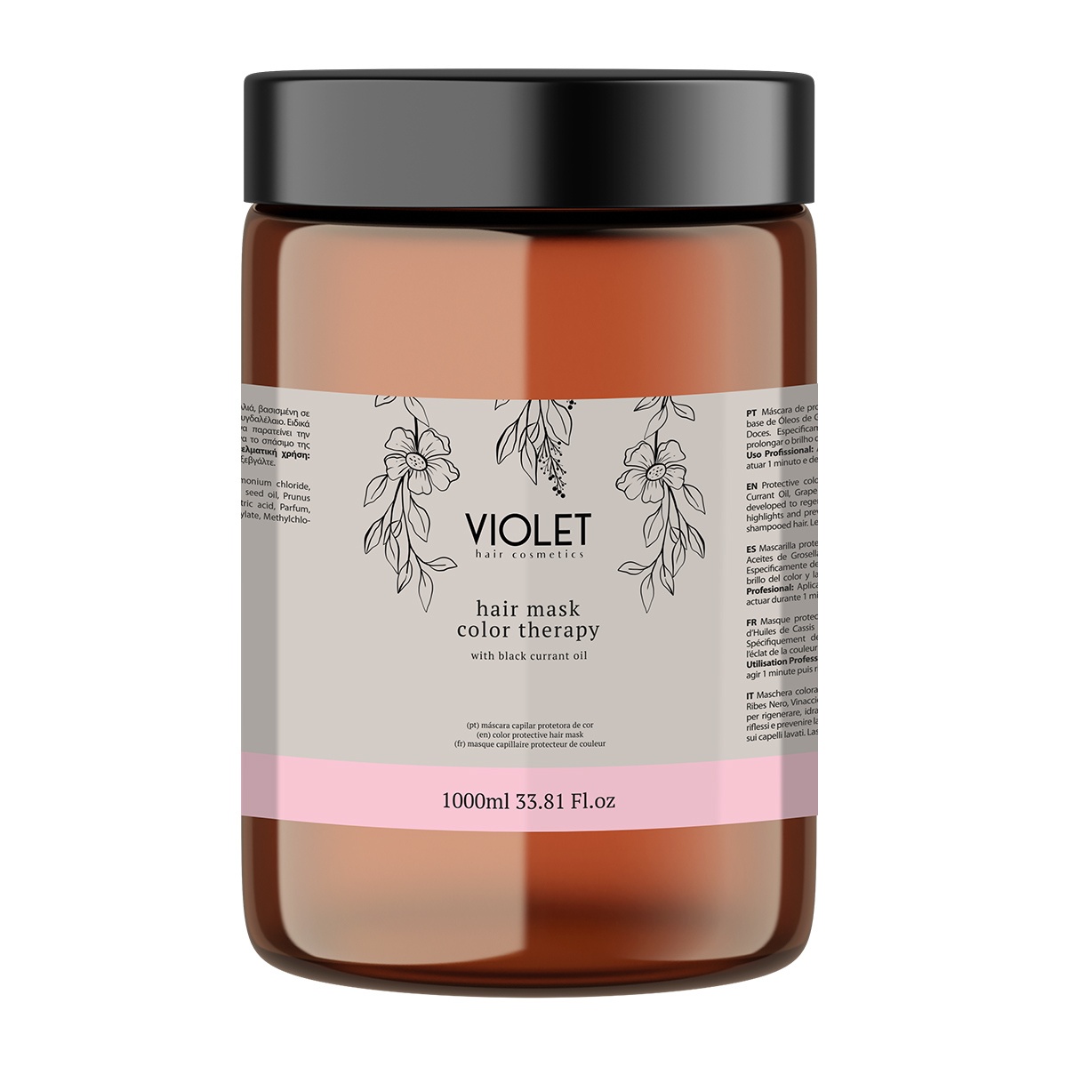 Masque protecteur de couleur COLOR THERAPY pour cheveux colorés, à base d’huiles de cassis noir, de pépins de raisin et d’amande douce. Spécifiquement formulé pour régénérer, hydrater, prolonger l’éclat de la couleur et des mèches ainsi que prévenir la casse des cheveux. Marque Violet. 1000 ml. Cruelty free et Vegan. Formulé sans SLS, SLES, SILICONES, MINERAL OIL, et Colorants artificiels.