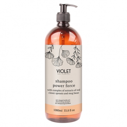 Shampooing fortifiant POWER FORCE pour cheveux fragilisés ou tombants à base d'un complexe d’extraits de germes de trèfle et de haricot mungo. Spécifiquement développé pour renforcer et favoriser la croissance des cheveux. Idéal pour homme ou femme. Marque Violet. 1000 ml. Cruelty free et Vegan. Formulé sans SLS, SLES, SILICONES, MINERAL OIL, et Colorants artificiels.