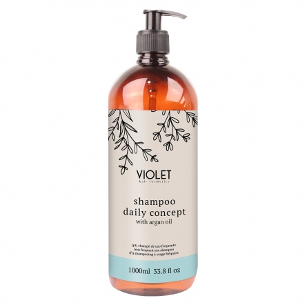 Shampoing DAILY CONCEPT à base d’huile d’argan, pour tous types de cheveux, spécifiquement développé pour hydrater et protéger les cheveux contre les radicaux libres et le vieillissement. Idéal pour les cheveux qui nécessitent des lavages fréquents. Marque Violet. 1000 ml. Cruelty free et Vegan. Formulé sans SLS, SLES, SILICONES, MINERAL OIL, et Colorants artificiels.