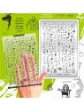 Chaque plaque est vendue avec le pochoir de démonstration qui lui correspond. Il s'agit d'un pochoir transparent plastifié vous permettant d'essayer et de choisir en amont les motifs de votre plaque de stamping Taki Da. Vous pouvez par transparence visualiser le rendu sur vos ongles ou sur ceux de vos clientes avant de procéder au stamping. Cette invention ingénieuse va vous fait gagner un temps précieux. Vous pouvez laisser libre cours à votre créativité en combinant les motifs de différents pochoirs de démonstration entre eux. La fiche peut être peinte avec du vernis. Elle se nettoie facilement avec de l'acétone.